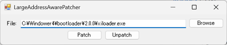 • ダウンロードしたLargeAddressAwarePatcher.exeを実行し、Browseからxiloader.exeを選択し、Patchボタンを押すことでxiloader.exeが書き換わりLAAが有効になります。